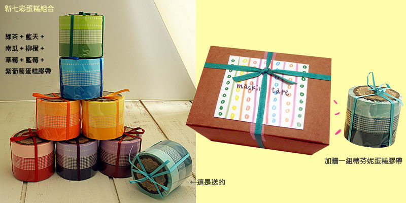 編號:P039 品名:新七彩蛋糕膠帶禮盒組 紫葡萄+藍天+草莓+柳橙+綠茶+藍莓+南瓜蛋糕膠帶(每款三色,共21入) 加贈一組蒂芬妮蛋糕膠帶(3入) 產地:日本進口 尺寸:15mmx15mx3捲x8組 售價:$2,980 特價:$2,680